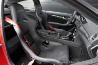 Im Innernaum, der ganz in Schwarz und Rot gehalten ist, herrscht ebenfalls eines Atmosphäre wie auf einem Sportplatz. Eine Rückbank gibt es nicht. Die Piloten lassen sich auf Schalensitzen nieder. Gelenkt wird der Mercedes C63 AMG Black Series mit einem speziellen Sportlenkrad, das über Schaltpaddels zwecks manueller Gangwechsel verfügt. Die Markteinführung für die vierte Black Series Generation ist für den Januar 2012 geplant. Der Verkaufspreise für den neuen Superstar unter den zweitürigen Coupés beginnen bei 115.430 Euro.
