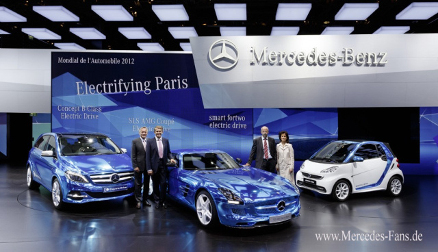 Mercedes-Benz und smart auf dem Mondial de lAutomobile 2012 in Paris: Dr. Joachim Schmidt, Mitglied der Geschäftsleitung Mercedes-Benz Cars, Vertrieb & Marketing, Prof. Dr. Thomas Weber, Mitglied des Vorstands der Daimler AG und verantwortlich für Konzernforschung sowie Mercedes-Benz Cars Entwicklung, Dr. Dieter Zetsche, Vorstandsvorsitzender der Daimler AG und Leiter Mercedes-Benz Cars, Dr. Annette Winkler, Leiterin smart, präsentieren das Mercedes-Benz Concept B-Class Electric Drive, Mercedes-Benz SLS AMG Coupé Electric Drive und den smart fortwo electric drive (von links nach rechts).