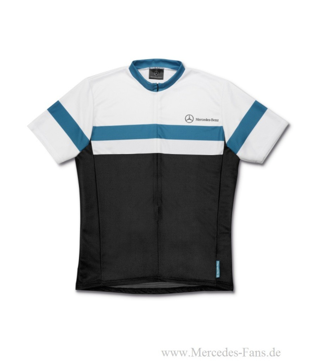 2013 neu im Programm ist das Bike Trikot für Herren in der Farbkombination schwarz/weiß/petrol. Es besteht zu 100 Prozent aus atmungsaktivem und schnell trocknendem Polyester, besitzt drei Rückentaschen, davon eine mit Reißverschluss und Reflektorpiping. Für Markenidentität sorgen Mercedes-Benz Stern und Schriftzug. Das Trikot ist erhältlich in den Größen S bis XXL und kostet 64,90 Euro.