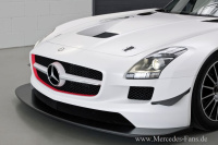 Das puristische Design und die atemberaubende Formgebung des Flügeltürers werden durch die gezielten Modifikationen an der Karosserie wirkungsvoll betont. Die neuen, großteils aus leichtem Carbon gefertigten Komponenten geben deutliche Hinweise auf die außergewöhnliche Rennstrecken-Performance und die umfangreiche aerodynamische Entwicklungsarbeit. Von vorn zeigt der GT3-Rennwagen eine neue Frontschürze mit größeren Lufteinlässen: Die breite Öffnung unterhalb des charakteristischen Kühlergrills mit dem großen Mercedes-Stern und der flügelförmigen Querfinne versorgt den Motorölkühler und die Bremsscheiben mit Kühlluft. Die gleiche Funktion haben die beiden Einlässe unterhalb der vertikal ausgerichteten Bi-Xenon-Scheinwerfer. Für Abtrieb an der Vorderachse sorgt neben den vier außen angebrachten, sogenannten Flics auch der Carbon-Frontsplitter: Er geht direkt in die glatte Unterbodenverkleidung über, an die sich der Heckdiffusor anschließt.
