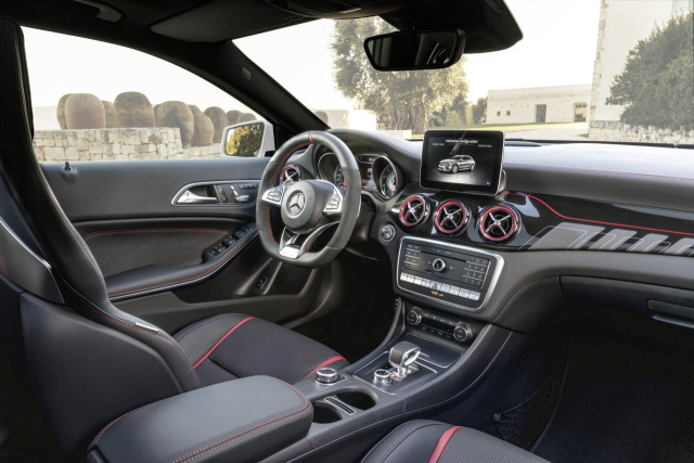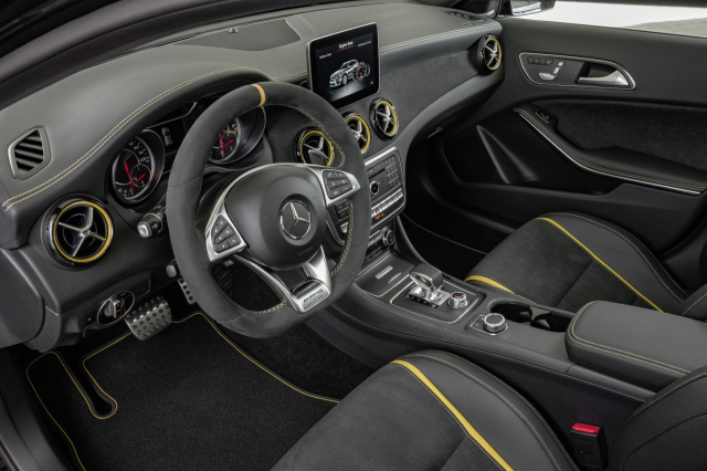 Auch das Interieur ist durch die umfangreiche Ausstattung und gelbe Akzente geprägt. Die AMG Performance Sitze in Ledernachbildung ARTICO/Mikrofaser DINAMICA tragen ebenso gelbe Zierelemente wie das AMG Performance Sportlenkrad in Mikrofaser DINAMICA, die Rücksitzbank, die Instrumententafel, die Bordkanten (nur beim CLA 45 4MATIC) und die Armauflagen. Weitere Highlights sind die Einstiegsleisten in Graphitgrau mit gelbem AMG Logo, die Fußmatten mit gelber Paspel, ebenfalls gelbem AMG Logo, sowie die gelben Luftaustrittsdüsen.