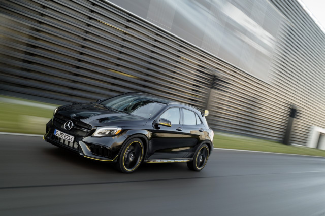 Die ausschließlich in Nachtschwarz oder Cosmosschwarz lackierten Sondermodelle sind durch ihre einzigartige Kombination aus graphitgrau matten und gelben Applikationen sofort zu erkennen. Den exklusiven Eindruck unterstreichen die Leichtmetallräder in Schwarz matt mit gelben Felgenhörnern und die schwarz lackierte AMG Doppellamelle im Kühlergrill. Gelbe Highlights kennzeichnen die Frontschürze, die Außenspiegelgehäuse, die Einleger in den Seitenschwellern, den Heckdiffusor und den Heckflügel (bei A 45 4MATIC und GLA 45 4MATIC). Den besonderen Charakter betonen darüber hinaus die AMG Sportstreifen in Graphitgrau matt (foliert) auf Motorhaube, Dach, Heckdeckel und Fahrzeugseiten.
