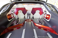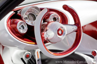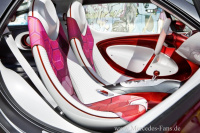 Glatt gespannte Oberflächen in Perlmuttweiß kombiniert mit präzise ausgeführten technischen Funktionselementen in gebürstetem Aluminium Kontraste bestimmen den Innenraum. Für Verbindung zum Exterieur sorgt der im Interieur gleichfalls akzentuiert eingesetzte Farbton Alubeam rouge. Lässig und unkompliziert sowie hoch funktional und leicht individualisierbar die beiden Sitze des Konzeptautos sind typisch smart. Die durchbrochenen Sitzschalen sind mit einem weichen Stoffüberwurf bezogen und bieten dadurch ein hängemattenähnliches Sitzgefühl. Die grafischen Elemente und verschiedenen Rottöne der Bezüge deuten einen Verlauf an und unterstreichen damit die Dynamik und den sehr modischen Aspekt des Fahrzeugs.