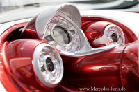 Schwarz glänzende Verkleidungen, die sich unterhalb des Schwellers fortsetzen, betonen die Radauschnitte. Der smart forstars rollt auf Michelin Sportreifen der Dimension 245/35 ZR 21. Ein schönes Detail sind die Abdeckungen der Flügelmuttern der Zentralverschlüsse der Dreispeichen-Räder. Der sportlich freche Charakter des smart forstars wird ebenfalls durch eine auffällige und technisch sehr aufwendige rote Alubeam-Lackierung betont. Der wet look des Alubeam rouge steht in einem spannungsvollen und sehr modernen Kontrast zum matten und ausgesprochen metallisch wirkenden Titanfarbton der Tridionzelle.