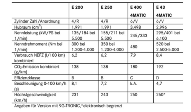 Zum Marktstart stehen für den neuen Kombi die Modelle E 200 mit Vierzylinder-Benzinmotor (135 kW/184 PS) und E 220 d (143 kW/194 PS) mit dem völlig neu entwickelten Vierzylinder-Dieselmotor sowie der E 250 mit 155 kW (211 PS) und einem Drehmoment von 350 Newtonmeter zur Verfügung. Im vierten Quartal 2016 folgen der E 200 d mit 110 kW (150 PS), der E 350 d mit Sechszylinder-Diesel sowie der E 400 4MATIC, dessen Sechszylinder-Benzinmotor 245 kW (333 PS) leistet und über ein Drehmoment von 480 Newtonmeter verfügt. Alle Modelle sind bei der Markteinführung mit dem neuen Neungang-Automatikgetriebe 9G-TRONIC ausgerüstet.