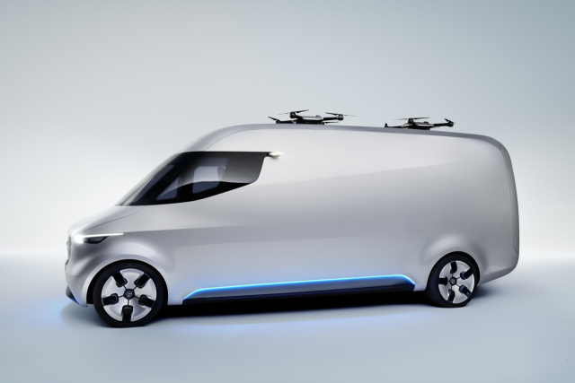 Der Vision Van verfügt über einen vollautomatisierten Laderaum, integrierte Drohnen zur autonomen Luftzustellung und eine moderne Joystick-Steuerung. Dank eines 75 kW starken Elektroantriebs mit bis zu 270 km Reichweite erfolgt die Zustellung mit dem Vision Van lokal emissionsfrei. Der Elektroantrieb garantiert zudem, dass der Vision Van auch bei innerstädtischen Fahrverboten für Verbrennerfahrzeuge in der City betrieben werden kann. Da der Elektroantrieb nahezu lautlos arbeitet, erleichtert er Spätzustellungen in Wohngebieten für die Lieferoption Same Day Delivery. „Mit dem Vision Van stellen wir den intelligenten, sauberen und vollvernetzten Transporter der Zukunft vor“, sagt Volker Mornhinweg, Leiter Mercedes-Benz Vans. „Der Vision Van führt viele konkrete Konzepte für die künftige Zustellung im urbanen Raum zusammen, zum Beispiel einen vollautomatischen Laderaum, autonom fliegende Lieferdrohnen und neuartige Kommunikationsfeatures.“