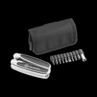 Multifunktionswerkzeug, schwarz, Edelstahlgriffschalen mit Kunststoffeinlagen, enthält Feile, Kreuz- und Schlitzschraubendreher, Säge, Klinge, Bithalter-Glasbrecher-Kombination, 9 Bits, Dosenöffner-Kapselheber-Kombination, Metalldrahtbieger, patentiert, im Etui mit Bitaufnahme und Gürtelschlaufe, Logo-Gravur auf dem Werkzeug, Mercedes-Benz Label auf dem Etui.
