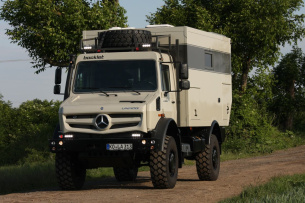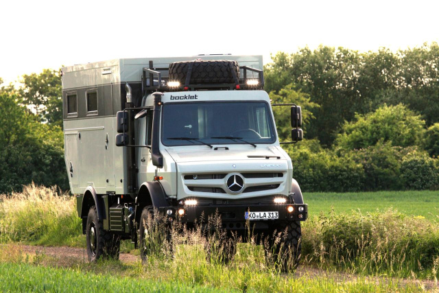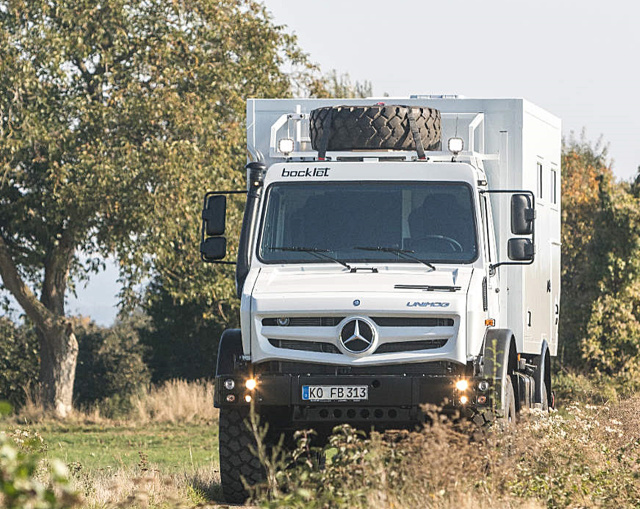 Der Unimog hat unbestritten Nehmer-Qualitäten, und ist sicher einer der besten Allrad-Lkw, die man weltweit für (gutes) Geld kaufen kann. Dies gilt vor allem für die hochgeländegängigen Modelle, die an einer vierstelligen Ziffernbezeichnung (im Gegensatz zu den dreistelligen der „Geräteträger“) erkennbar sind. Bocklet setzt auf den Unimog in der Version als U4023 (mit einem Radstand von 3.850 mm) eine Wohnkabine, die in bewährter Weise als GfK-Sandwichkonstruktion ausgeführt ist. Mit einer Wand- und Dachstärke von 50 mm (Bodenstärke 60 mm) sind die Aufbauten gut gegen äußere Einflüsse isoliert. Die Tanks für Frisch- und Abwasser haben 250 bzw. 130 Liter Fassungsvermögen und sind innenliegend und beheizt untergebracht. Der Wohnbox selbst ist klassisch im „quadratisch - praktisch - gut“-Stil gehalten. Lediglich im Heckbereich ist der weltreisetaugliche Aufbau angeschrägt. So werden die guten Geländeeigenschaften des Allrad-Lasters nicht weiter eingeschränkt.
