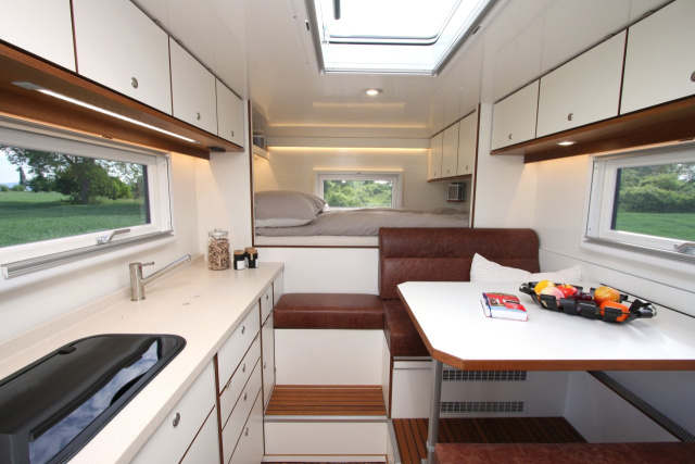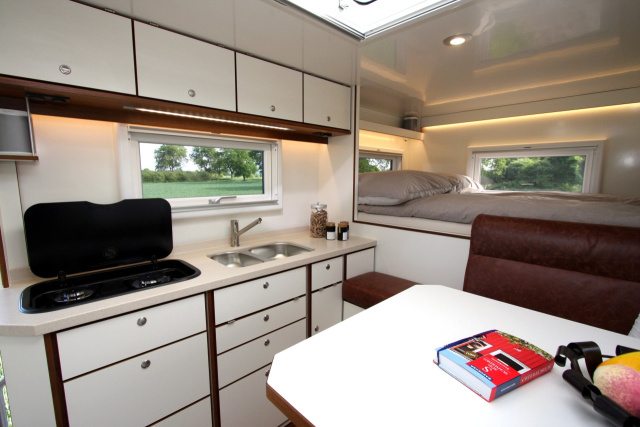 Der Wohnraum ist vom Fahrerhaus über einen verschließbaren Durchgang her erreichbar, ebenso über eine Außentür auf der Beifahrerseite. Direkt ans Fahrerhaus schließt sich das Sanitärabteil an, ausgestattet mit Waschbecken, Dusche und Kassetten-WC. Mittig auf der Fahrerseite ist der Küchenblock angeordnet, mit zweiflammigem Kocher, Spüle, Haushaltsarmaturen und reichlich Stauraum, der durch Dachstaukästen optimal ergänzt wird. Ein 80 Liter fassender Kompressor-Kühlschrank hält Getränke und Speisen frisch und kühl. Den Heckbereich nimmt die Schlafstatt ein, die mit einer Liegefläche von 200 x 130 Zentimeter beinahe so groß ausgefallen ist wie Zuhause.
