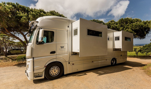 Basis des Erstlingswerks von Ebner, der Edition I, ist ein Mercedes-Benz Actros 1842 Gigaspace mit einem Radstand von 6,1 Metern. Sein Sechs-Zylinder-Motor hat 12,7 Liter Hubraum und bringt es auf eine Leistung von 421 PS. Darauf kann man, im wahrsten Sinne des Wortes, aufbauen. Im Falle von Edition I ist das ein insgesamt 10,6 Meter langes und rund 16 Tonnen schweres Gefährt mit einem Aufbau aus 50 Millimeter starken GfK-Sandwich-Paneelen, versehen mit gleich zwei Slide-Outs, ausfahrbaren Erkern auf der Fahrerseite. Bis zum Erreichen des zulässigen Gesamtgewichts von 18 Tonnen bleiben satte zwei Tonnen Zuladung. Da darf dann auch der Frischwassertank mit 750 Litern Inhalt gerne gefüllt werden.