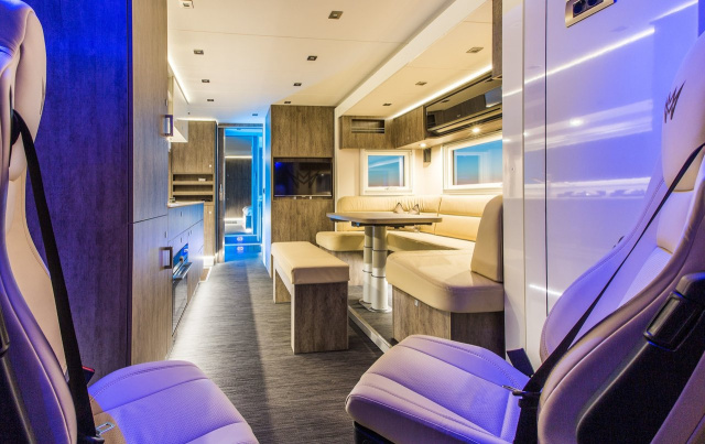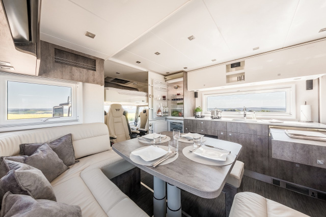 Erker eins des knapp vier Meter hohen Mobils vergrößert den Raum zwischen der 140 x 230 cm großen U-Sitzgruppe, geeignet für bis zu acht Personen, und dem gegenüber liegenden 2,60 Meter langen Küchenbereich. Für Lebensmittel und Getränke steht ein 180 Liter großer Kühlschrank mit 70 Liter Gefrierabteil bereit. Hinzu kommen zwei Gasbrenner sowie Backofen-, Mikrowellen- und Grill-Kombination. Die Arbeitsplatte ist aus Marmor, das Waschbecken aus Edelstahl.