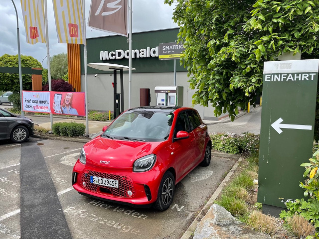 Klar ist, wer schnell von A nach B oder gar ans Ziel seiner Träume kommen will, sollte die Elektromobilität auf Mittel- und Langstrecken schnell wieder aus seinem Kopf streichen. Das Fahren ist das eine; das Laden etwas anderes und das kostet Zeit oder vielleicht auch einmal ein paar Nerven. Da es nach erfolgreichem Grenzübertritt Richtung Österreich auf der Landstraße 148 und der Weiterreise Richtung Süden auch auf der Autobahn A9 munter weiterläuft, dürstet es den regengebeutelte smart forfour ed in der Nähe von Haag am Hausruck nach erneuter Energieaufnahme, denn die Reichweite springt von 20 Restkilometern auf ein paar Striche im Bordcomputer. Letztlich sind es gerade noch rund zwölf Prozent. Die lokale Ladesäule zickt und so braucht es mehrere Versuche. Letztlich lädt das rote Spielmobil in 1.13 h auf stattliche 100 Prozent wieder auf, während es eine kleine Kaffeepause im Café ein paar Kilometer weiter und nicht in dem McDrive nebenan gibt.