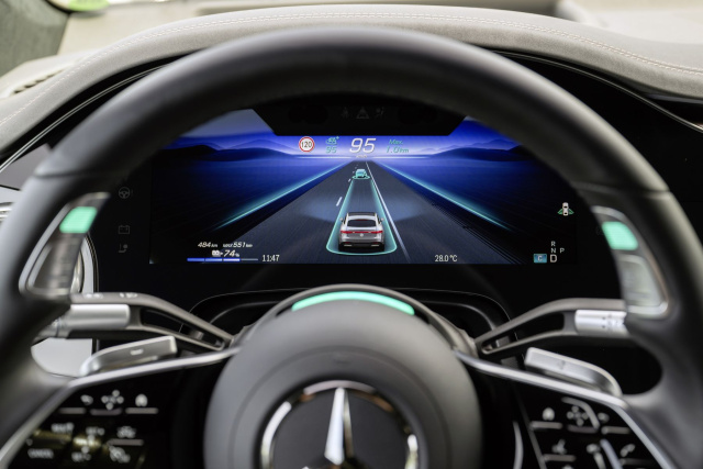 „Jeder Sensor hat Stärken und Schwächen“, erklärt Taner Kandemir, der bei Mercedes für das autonome Fahren verantwortlich ist. Deshalb sind die robusten Radarsensoren, die auch bei Nebel und Schmutz funktionieren, genauso wichtig wie die Antenne auf dem Dach, die mit Satelliten in 250 Kilometern Höhe und den extrem genauen Karten des Navigationssystems hilft, die Position des Autos auf den Zentimeter genau zu bestimmen. Basis für den Drive-Pilot sind aktuelle Fahrzeuge, die mit mehr als 40 Assistenzsystemen an Bord automatische Fahrmanöver des Levels 2 + ausführen können. Deshalb beherrscht auch der EQS, in dem wir hinter dem Lenkrad sitzen, einen selbsttätigen Spurwechsel, solange die Hände am Volant bleiben. Das darf der Drive-Pilot-Benz des Levels 3 normalerweise nicht. Ab Anfang des nächsten Jahres werden fabrikneue S-Klassen und EQS-Modelle mit dem Drive-Pilot 95 ausgeliefert. Bestehende Fahrzeuge mit Drive Pilot 60 erhalten ein kostenloses Update.