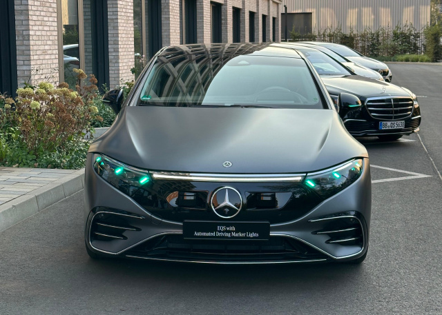 Noch ist es eine Mercedes-Benz-Idee: Die türkisfarbenen Markierungsleuchten in den Scheinwerfern, Spiegeln und Heckleuchten könnten neuer Standard bei allen Herstellern werden. Diese zeigen anderen Fahrern oder Einsatzfahrzeugen an, dass ein Fahrzeug gerade hochautomatisiert fährt.