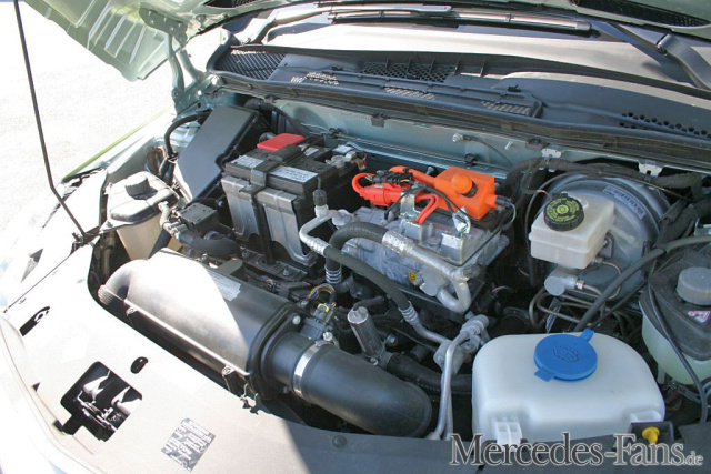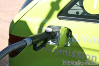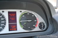 Die erste Kontaktaufnahme mit der F-Cell B-Klasse verlief völlig unspektakulär. Bis auf die knallige grüne Folienbeklebung unterscheidet sich diese B-Klasse nicht von der normalen. Dies betrifft auch den Innenraum. Lediglich das Kombiinstrument macht hier eine Ausnahme. Statt eines Drehzahlmessers ist hier eine Anzeige für die aktuell abgerufene Motorleistung mit kW-Angabe platziert.