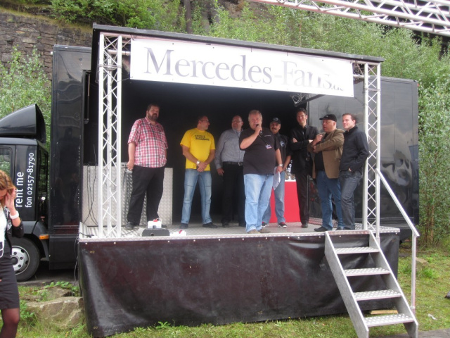Rund 90 Minuten dauerte die Pokalvergabe, bei der die Besitzer ihre schönen Sterne noch einmal präsentieren konnten. Wegen der aufziehenden Wolken waren allerdings schon einige Teilnehmer abgereist, aber immerhin 44 der 50 Pokale konnten vor dem begeisterten Publikum an die Mercedes-Fans übergeben werden!