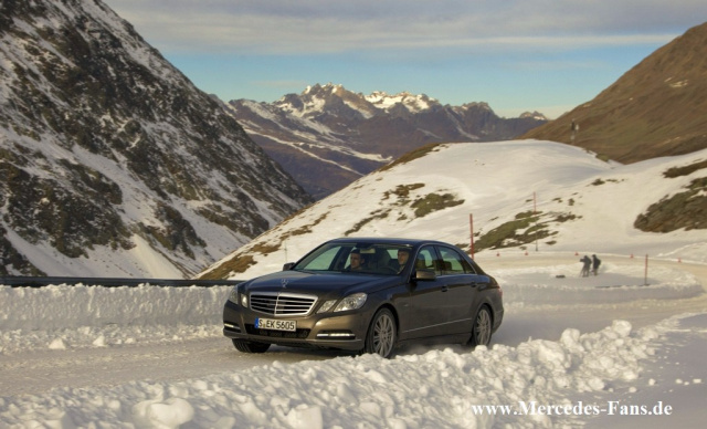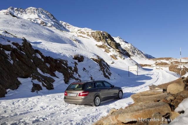 Bei unseren Testfahrten im schon winterlichen Hochgurgl und der bereits gesperrten Passstraße Timmelsjoch erfuhren wir das System auf geschlossener Schneedecke mit zum Teil vereistem Untergrund. Bei der Beschleunigung aus dem Stand an einer Anhöhe geben wir Vollgas und wie an einer Schnurr gezogen bewegt sich die E-Klasse nach vorn, das Allrad-Regelsystems 4ETS sorgt für die schleuderfreie und somit fahrstabile Beschleunigung. Gut so, denn aufgrund des herrschenden Nebels war die Strecke nur anhand der langen Schneepflugstangen auf der Talseite gut zu erkennen.
