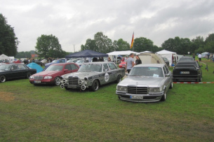 Schon am Vorabend waren die ersten Mercedes-Fans angereist und ließen sich von dem "bißchen Wasser" auch nicht vertreiben. Und am eigentlichen Veranstaltungstag kamen die Teilnehmer schon früh und immer mehr über den Tag verteilt. Das Programm des Mercedes-Treffens Harsewinkel besteht neben den Benzingesprächen auch aus der Vorstellung der Fahrzeuge unter dem berühmten Fallschirm, dazu gibt es eine Musikanlagen-Messeung sowie Auspuff- und Ansaug-Soundmessung und die beliebte Tombola, bei der dieses Jahr ein Mercedes-Benz 190E (W201) der Hauptpreis war.