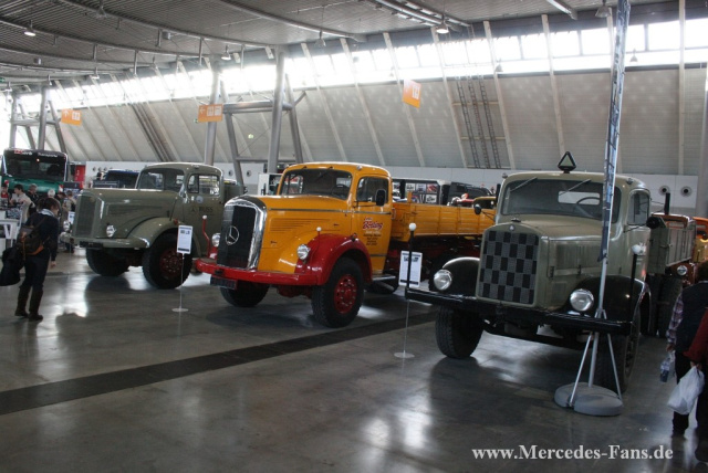 Mercedes-Benz Nutzfahrzeuge hat dazu einen Teil der Sammlung historischer LKWs und drei modernen Fahrzeugen mitgebracht. Endstanden ist so ein Rundgang durch die Geschichte der Baufahrzeuge der Nachkriegszeit, - von Langschnauzer, Rundhauber und die ersten LP-Frontlenker der 60er Jahre, die so genannte Neue Generation der 70er- und 80er-Jahre, - überwiegend Allrad-Kipper wie sie einst und teilweise noch heute ihren Dienst im Baugewerbe erfüllen.