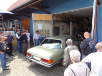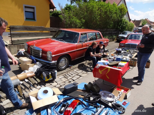 Wer erst mal wissen möchte WELCHE Teile überhaupt für das eigene Projekt benötigt werden, der wird sich am Samstag für mindestens einen der verschiedenen Workshops angemeldet haben. Was für Workshops es gab? Das kann man nicht so genau sagen, da manchmal in letzter Minute durch Krankheit oder Fahrzeugmangel auch schon mal ein Workshop ausfallen kann. Gesichtet wurden jedenfalls Stammtische in denen es um die Demontage der hinteren Seitenscheiben am S123, um Arbeiten und Begutachtung an einer Flosse, W124 Hydrostößel wechseln am OM603 oder auch um die TÜV-Abnahme eines 116ers ging. Egal bei welchem Stammtisch, die Teilnehmer scharten sich um die Objekte und versuchten Ihr Wissen zu vermehren um anschließend nach den entsprechenden Teilen wiederum in der Teilehalle oder an den Teilemarktständen zu suchen.