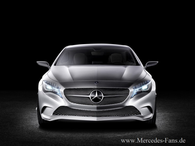 Die Front des Concept A-Class zieht alle Blicke auf sich. Das Markenlogo scheint von einem Sternenhimmel umgeben. Denn wo sonst Löcher oder Lamellen sitzen, besteht der Grill aus zahlreichen silbermetallischen dots auf schwarzen Säulen. Dieses Thema findet sich wieder im Design der Felgen. Ein besonderer Zauber geht vom Licht des Concept A-Class aus, denn seine innovativen LED High-Performance-Scheinwerfer greifen mit zahlreichen Lichtpunkten das Sternenhimmel-Motiv auf. Für das Tagfahrlicht wurden dazu 90 Glasfaserelemente mit Aluminiumhülsen versehen und flügelförmig im Scheinwerfer angeordnet.