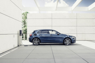 Die E-Maschine leistet 75 kW. Zusammen mit dem 1,33 Liter großen Vierzylindermotor ergibt dies eine Systemleistung von 160 kW (218 PS) und ein Systemdrehmoment von 450 Nm. Durch die EQ Power der E-Maschine reagieren A 250 e und B 250 e besonders spontan auf den Tritt aufs Gaspedal. So braucht der A 250 e beispielsweise 6,6 Sekunden für den Spurt von 0 auf 100 km/h, und seine Höchstgeschwindigkeit beträgt 235 km/h. Als elektrischer Energiespeicher wird eine Lithium-Ionen-Hochvoltbatterie mit einer Gesamtkapazität von ca. 15,6 kWh verwendet, die an einer externen elektrischen Energiequelle aufgeladen werden kann. A 250 e und B 250 e lassen sich mit Wechsel- oder Gleichstrom aufladen. Eine entsprechende Ladedose befindet sich in der rechten Seitenwand der Fahrzeuge. So sind die kompakten Plug-in-Hybride an einer 7,4-kW-Wallbox mit Wechselstrom (AC) binnen 1 h 45 min von 10-100 Prozent SoC (Status of Charge, deutsch: Ladestand) aufgeladen. Beim Gleichstromladen (DC) beträgt die Ladezeit etwa 25 Minuten von 10-80 Prozent SoC. Die Batterien stammen von der 100-prozentigen Daimler Tochter Deutsche ACCUMOTIVE. Die Hochvoltbatterie ist wassergekühlt und wiegt ca. 150 kg.
