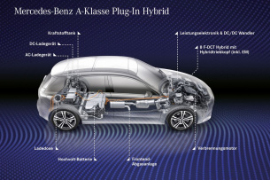 - Höchstgeschwindigkeit 140 km/h (elektrisch)/235 km/h (gesamt; A-Klasse Kompaktlimousine)