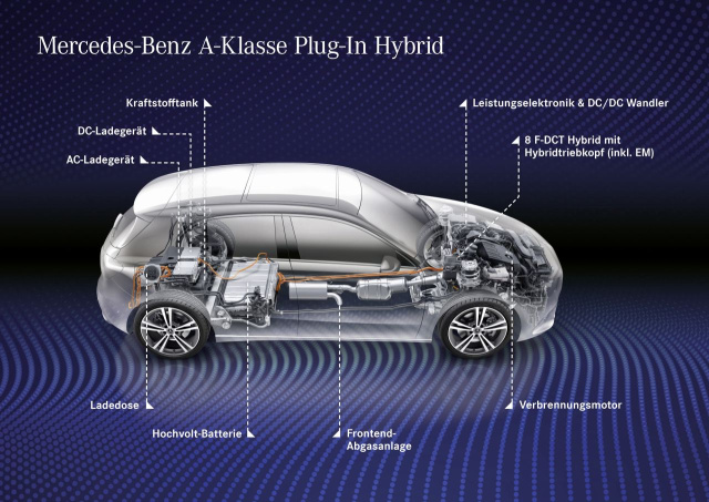 Eine innovative Abgasanlage ermöglicht ein geschicktes Packaging: Der Auspuff ist nicht bis ans Fahrzeugende geführt, sondern mündet zentral unter dem Fahrzeugboden, der Endschalldämpfer wurde in den Mitteltunnel gepackt. Die Integration des Kraftstofftanks in den Achsbauraum schafft Platz unter den Rücksitzen für die Hochvoltbatterie. So kommt es bei A 250 e und B 250 e nur zu geringen Einschränkungen des Kofferraumvolumens gegenüber den nicht hybrid-motorisierten Schwestermodellen. Weil die Kompaktfahrzeuge die Technik der dritten Plug-in-Generation verwenden, stehen auch alle deren Funktionen zur Verfügung. Dazu zählt insbesondere die intelligente, streckenbasierte Betriebsstrategie; sie berücksichtigt u.a. Navigationsdaten, Geschwindigkeitsvorschriften und Streckenverlauf. Die Betriebsstrategie berücksichtigt die gesamte geplante Route und sieht den elektrischen Fahrmodus für die jeweils sinnvollsten Streckenabschnitte vor.
