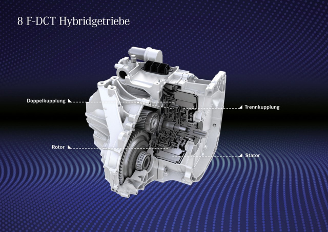 Die Fahrzeuge der Kompaktwagen-Familie von Mercedes-Benz besitzen quer eingebaute Motoren. Für das Doppelkupplungsgetriebe 8F-DCT wurde ein kompakter Hybridtriebkopf entwickelt, der den gleichen technischen Prinzipien folgt wie das entsprechende Bauteil der Fahrzeuge mit Längsmotor. Es handelt sich um eine permanenterregte Synchronmaschine als Innenläufer. Der Stator ist fest in das Triebkopfgehäuse integriert, innerhalb des Rotors der E-Maschine ist die verlustarme nasse Trennkupplung untergebracht. Bedarfsgerechte Stator- und Rotorkühlung erlauben es, Spitzen- und Dauerleistung der E-Maschine problemlos zu nutzen. Erstmals bei Mercedes-Benz erfolgt der Zustart des Verbrenners ausschließlich durch die E-Maschine, die Kompakt-Hybriden besitzen keinen separaten 12-Volt-Starter („Anlasser“).