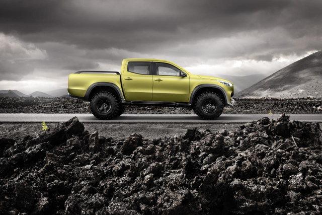 Ergänzend zum Concept X-CLASS stylish explorer fokussiert das zweite Konzeptfahrzeug auf die klassischen Eigenschaften eines Pickups. Das in Lemonaxmetallic lackierte Concept X-CLASS powerful adventurer setzt Robustheit, Belastbarkeit und Geländegängigkeit aufmerksamkeitsstark in Szene. Damit unterstreicht es eindrucksvoll, dass der Mercedes-Benz Pickup Komfort und Stil mit den Grundtugenden in dieser Fahrzeugklasse verbindet.