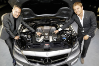 Dafür kann man seiner Philosophie auch ruhig einmal untreu werden: Der AMG 5,5-Liter-V8-Biturbomotor des CLS 63 AMG Shooting Brake Edition 1 bei der Hockenheim-Präsentation wurde von Michael Schumacher und Nico Rosberg am 18. Juli 2012 anlässlich ihres Besuchs bei Mercedes-AMG in Affalterbach montiert.
