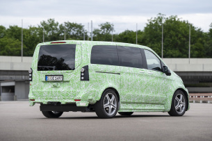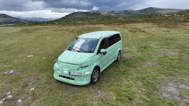 Dr. Andreas Zygan, Entwicklungsleiter der neuen Van.ea-Plattform hat in erster Linie jedoch die neuen Elektromodelle im Blick und mit denen ging es in diesem Sommer erstmals auf große Tour von Stuttgart ans Nordkap zu einem frühen Härtetest. Über 3.300 Kilometer, auf denen die grün-weiß beklebten Prototypen zeigen mussten, was sie können. Die Probanden im Blechkleid der bisherigen V-Klasse fallen in erster Linie durch die wilde Beklebung und die stark ausgestellten Kotflügel auf, die sie martialischer als jede Tuningversion erscheinen lassen. Der Grund für die rustikalen Bastelarbeiten an den Prototypen ist jedoch die neue Elektroplattform, die deutlich mehr Spurweite als die aktuelle V-Klasse bietet und auch das mächtige Akkupaket im Unterboden braucht seinen Raum zur Energiespeicherung.