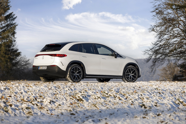 Fans der sportlichen Anleger aus Affalterbach kommen ebenfalls auf ihre Kosten. Da ist der AMG EQE 43 mit seinen 350 kW / 476 PS oder das neue Topmodell AMG EQE 53, der an beide Achsen stattliche 505 kW / 687 PS und 1.000 Nm maximales Drehmoment bringt. Bei der stärkeren 53er-Version gibt es nicht nur bis zu 240 km/h Höchstgeschwindigkeit, sondern auch die beim EQS SUV schmerzlich vermisste Wankstabilisierung. Serienmäßig bietet das Fahrwerk elektronische Dämpfer, das sich auf Wunsch um eine Luftfederung erweitern lässt. Die bringt nicht nur zusätzlichen Komfort für die Insassen, sondern variiert die Bodenfreiheit nach Gusto des Fahrers um bis zu drei Zentimeter. Ebenfalls auf Wunsch ist der Elektrocrossover mit einer Hinterachslenkung ausgestattet, die mit einem Lenkwinkel von bis zu zehn Grad den Wendekreis von 12,5 auf 10,7 Meter reduziert.