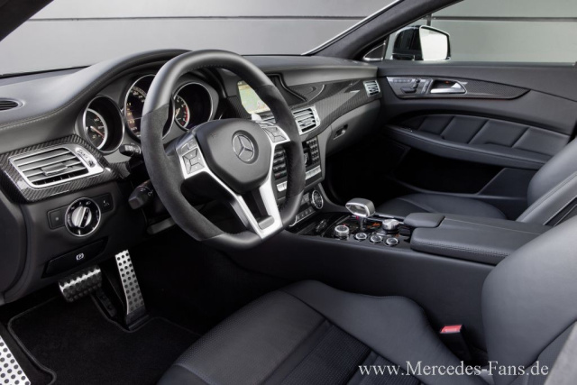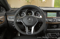 Hinter dem Lenkrad informieren drei röhrenförmige Cockpit-Rundinstrumente über Kühlmitteltemperatur sowie Tankinhalt (links), Fahrgeschwindigkeit (Mitte) und Motordrehzahl (rechts). Highlight der exklusiven CLS 63 AMG-Instrumentierung ist das farbige und dreidimensionale TFT-Display in der Mitte des Tachometers, es zeigt nach dem Öffnen der Fahrertür ein markantes AMG Logo zur Begrüßung des Fahrers. Die Rundinstrumente verfügen über eine eigene Grafik, rote Zeiger, eine 320-km/h-Tachoskala sowie ein charakteristisches AMG- und V8-Biturbo-Logo.