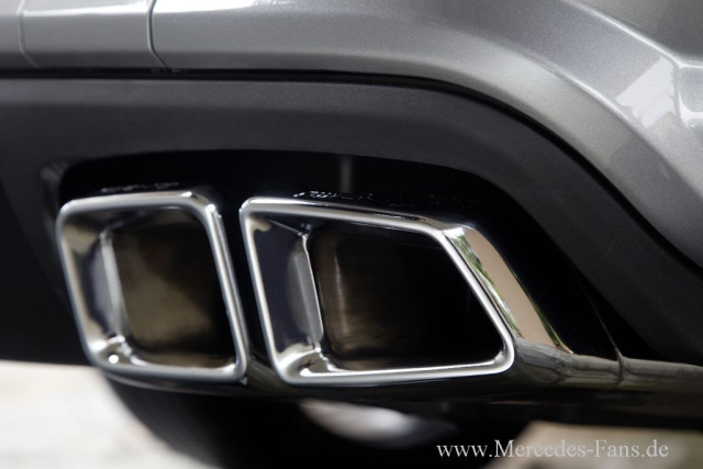 Die Zielsetzung bei der Entwicklung lautete: Emotional beim Beschleunigen und bei der Zwischengasfunktion, zurückhaltend bei konstantem Tempo. Störende Frequenzen oder Brummgeräusche wurden in aufwendigen Versuchsreihen wirkungsvoll ausgeschlossen. Aus der Sport-Abgasanlage entweicht ein sonorer, AMG-typischer Achtzylindersound die markanten und verchromten Doppelendrohre präsentieren sich im neuen Design.