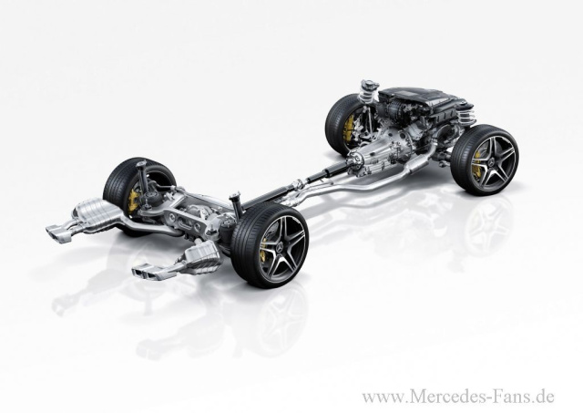 Die komplett zweiflutige AMG Sport-Abgasanlage verfügt von den Krümmern bis zu den Endschalldämpfern über einen Rohrquerschnitt von 70 Millimetern. Durch eine besonders intelligente Leichtbaukonstruktion konnten gegenüber dem Vorgängermodell 4,3 Kilogramm eingespart werden. Dies gelang den AMG Experten durch eine Verringerung der Wandstärken aller Abgasrohre sowie des Mittel- und der Nachschalldämpfer auf 1,2 Millimeter.