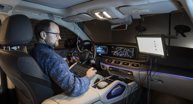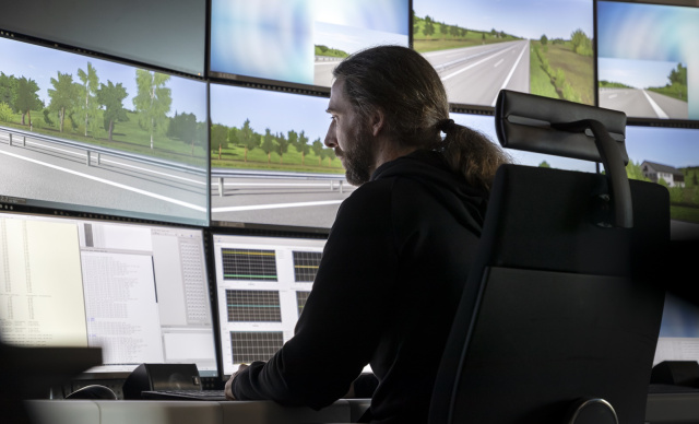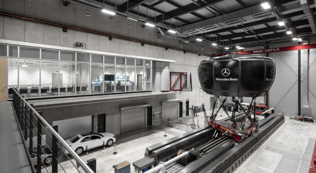 Nach der leichten Einstimmung mit Tempo 130 geht es mit Tempo 200 in einem Mercedes GLE Coupé in die Pylonengasse. Zuerst ist das Fahrzeug leer, mal mit schlechten Reifen oder einer ungünstigen Aerodynamik ausgestattet, die es anfälliger für die böigen Seitenwinde mit 60 km/h macht. Alles im grünen Bereich – leicht gegenlenken und in der Spur bleiben. Jeder mögliche Parameter kann hier variiert und getestet werden. Ein paar Klicks ein paar Meter weiter im Kontrollraum und aus dem Mercedes GLE Coupé die deutlich handlichere C-Klasse mit weniger Wankbewegungen in der Karosserie. Das gleiche noch einmal – die Unterschiede sind deutlich. So soll gewährleistet werden, dass das zukünftige Modell sich in jedem Fahrzustand wie ein echter Mercedes bewegt, anfühlt und dabei insbesondere sicher und souverän wirkt. „In dem Simulator können wir jede Erprobung nachfahren – immer wieder und das ganze so wetterunabhängig reproduzierbar machen. Das ist für uns extrem wichtig“, legt Markus Riedel nach, als es zurück in den Kontrollraum geht.