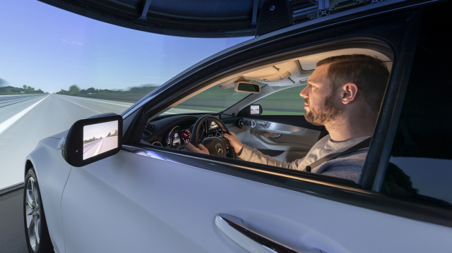 Über eine Brücke geht es aus dem Kontrollraum in eine Art Raumschiff – und das hebt gleich ab. In der Karbonkugel, die auf einem zwölf Meter langen Gleitschlitten nebst Dämpfern ohne jeden Bodenkontakt hin und her bewegt, befindet sich eine weiße Mercedes C-Klasse – umrahmt von mächtigen Bildschirmen, die wie ein 360-Grad-Kino erscheinen. „Das Modell ist aktuell eine C-Klasse, doch wie können mit dem Fahrsimulator jedes beliebige Fahrzeug auf den verschiedensten Strecken abbilden“, sagt Arne Felske, verantwortlich für den Bereich Handling Simulation. Der Eingang verschließt sich, die Brücke ins vermeintliche Raumschiff fährt zurück und das Auto legt nahezu lautlos ab in eine virtuelle Realität. Über Lautsprecher gibt es Anweisungen für die nächste Testfahrt. Alles, wie man es aus einem realen Auto kennt – Tür zu, anschnallen, Klimaanlage an und am Lenkrad die Fahrstufe einlegen. Diesmal geht es nicht auf eine Komfortstrecken, sondern es werden mit verschiedenen Fahrzeugen, Reifen und Beladungszuständen Ausweichmanöver gefahren.