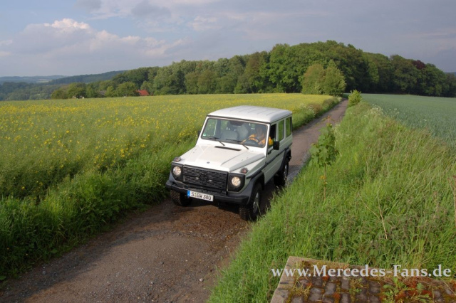 Nein, der G Professional wendet sich vorrangig sicher nicht an den Klassik-Freund -- wobei wir hier sehr spannende Begegnungen hatten -- sondern an denjenigen, der an den G-Wagen eher strapaziöse Ansprüche stellt. Und da scheint der Professional gut gerüstet. Das fängt bei der anwendungsorientierten Ausstattung an und hört bei den Fahrtalenten noch lange nicht auf! Das alles verpackt in ein Paket, das mehrere Besucher einer Mercedes Klassik-Veranstaltung dazu verführte, uns für den guten Pflegezustand unseres Geländewagen-Klassikers zu loben! Umso größer dann die Überraschung, als die Mercedes-Klassik-Freunde erfuhren, dass sie hier vor einem Neuwagen standen.