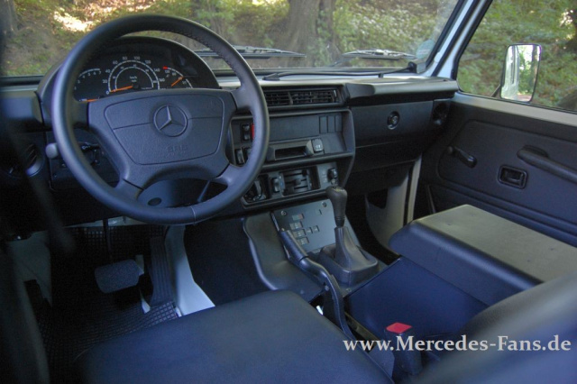Und die wird es freuen, dass sie Im Professional sehr ordentlich sitzen können. Das gilt auch für die Mitreisenden in der zweiten Reihe, die zwei Einzelsitze vorfinden. Das Fehlen unangebrachter Komfortausstattung rückt ein weiteres kostbares Gut unserer Zeit in den Mittelpunkt: Raum! Der G-Wagen bietet davon nicht nur viel auf der holzbewerten Ladefläche, sondern auch seinen Insassen! Dafür aber müssen diese fleißig an strammen Fensterkurbeln kurbeln, und die Türen wollen mit Nachdruck geöffnet und geschlossen werden. Spätestens am dritten Tag verspürt man keine Lust mehr alle vier Türen und die Heckklappe separat zu verschließen. Alles so wie früher! Oder eine optionale Zentralverriegelung ordern für 390 Euro netto.