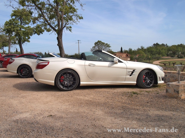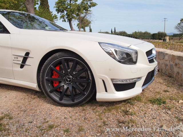 Was der neue SL63 AMG angesichts des ganzen technischen Aufwands und seines potenten V8-Biturbo-Motors auf der Piste drauf hat, soll er bei blauem Himmel und optimalen Temperaturen auf den kurvenreichen Bergstrecken im Norden von St. Tropez zeigen. Der gewählte Testwagen ist mit dem AMG Performance Package an Bord besonders gut ausstaffiert und seine samtig schillernde Matt-Lackierung in Kaschmirweiß ist ein zusätzlicher Eyecatcher.