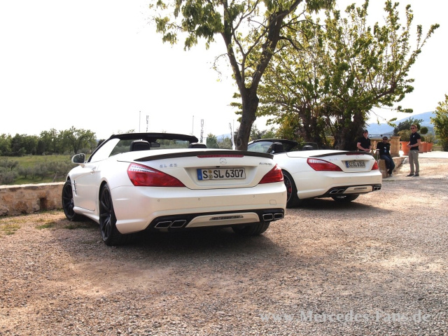 Nach einiger Fahrt durch Städtchen entlang der gewählten Strecke, lichtet sich der dichte Verkehr. Die ersten Kurven locken, der Fahrspaß kann beginnen: Den Dreh-Schalter auf Sport-Modus, das Gaspedal durchgetreten und das Monster schiebt unter gänsehauttreibenden, sonorem Gebrüll vorwärts. Die einsetzende Beschleunigung ist schlicht brutal, besonders wenn man bedenkt, dass hier trotzt Leichtbauweise immer noch satte 1.845 kg Leergewicht bewegt werden müssen. Der bullige V8 des SL63 AMG reagiert sofort auf jeden Gasschub und so sind auch Überholmanöver im Handumdrehen erledigt, wobei die abrufbare Leistung jede Menge Reserven bietet. Lediglich beim Kickdown aus dem Keller hält der Roadster für einen Augenschlag inne, bis die Beschleunigungsorgie einsetzt.