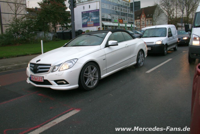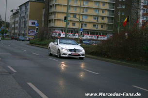 Ungetarnt - nur mit abgeklebten Emblemen fuhr ein weißes E-Klasse Cabriolet vor die Kamera-Linse unseres Mercedes-Fans.de-Redakteurs Thomas Frankenstein. Wie auf den bereits zuvor in unserem Online-Magazin gezeigten Erlkönig-Fotos auch schon zu erkennen, orientiert sich das Cabriolet erwartungsgemäß deutlich am Coupé. Dieses Mal sind auch die Scheinwerfer und das Kurvenlicht gut zu erkennen.