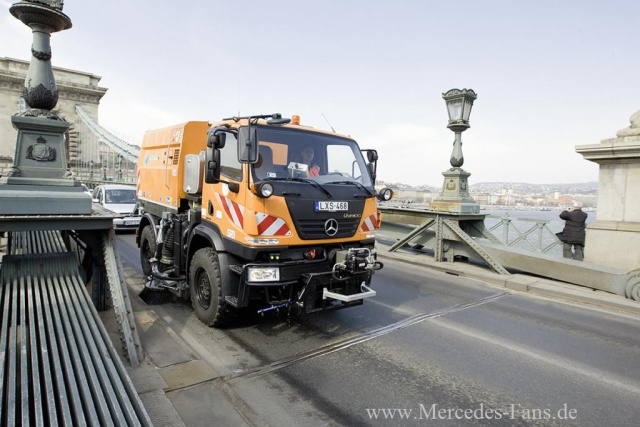 In der ungarischen Hauptstadt Budapest gehören sie nun schon zum alltäglichen Anblick: 21 Unimog U 20 von Mercedes-Benz arbeiten seit Oktober 2011 im Stadtteil Buda, in den Fußgängerzonen der Innenstadt und auf den Fußgängerwegen entlang der Donau. Die Qualitäten des Unimog U 20 hatten die Beschaffer des städtischen Reinigungsunternehmens EKF Zrt. überzeugt. Dabei spielte auch der Mehrfachnutzen des Unimog eine zentrale Rolle bei der Beschaffung: In den Winterwochen sind die Budapester Unimog mit Streuautomaten der Firma Gmeiner sowie Schneepflügen von Kahlbacher ausgerüstet, ab dem Frühjahr mit Kehrmaschinen des Typs TK 20 von Trilety. So ist jeder Unimog über das ganze Jahr hinweg permanent einsetzbar - eine hochwertige Kombination von Geräteträger und Geräten. Sie wird dringend benötigt in der weltberühmten, 1,7 Millionen Einwohner zählenden Metropole, denn diese stellt sehr spezielle Anforderungen an den Straßendienst.