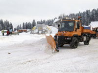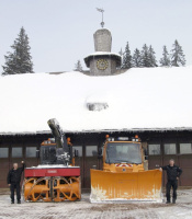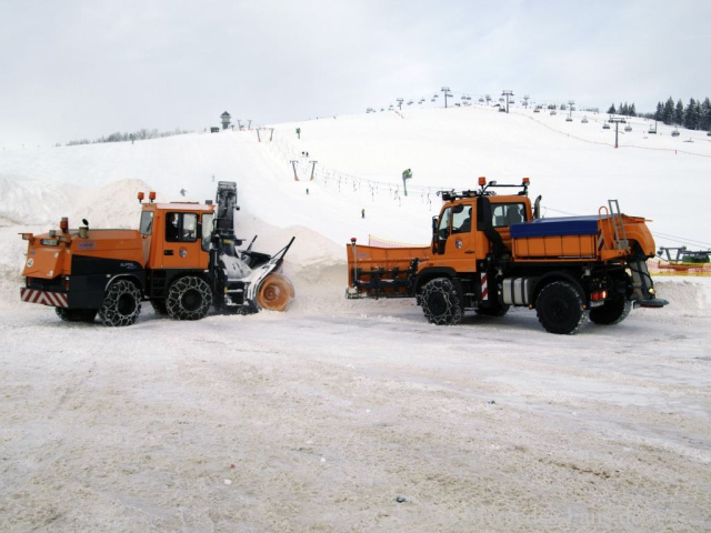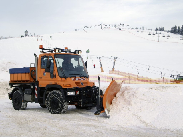 Über Nacht können in dieser schneesicheren Region schon einmal rund 70 cm Schnee fallen - eine extreme Herausforderung und anspruchsvolle Aufgabe besonders für den Winterdienst, der ab 3 Uhr morgens die Gemeindestraßen sowie die Zufahrten zum Feldberg-Hotel - das höchstgelegene Deutschlands - und den vielfrequentierten, weitläufigen Parkplätzen unterhalb der Liftanlagen räumt. Bis 8 Uhr morgens muss alles erledigt sein, denn dann nehmen Sessel- und Schlepplifte sowie die Rodelbahnen ihren Betrieb auf, Tagesbesucher und Übernachtungsgäste strömen zum Wintervergnügen. Erledigt werden diese Arbeiten vom Bauhof der Gemeinde, die für die jeweils acht Kilometer umfassende Tour rund um den Feldberg-Gipfel eine Maschinenkombination aus Schneefräse und Mercedes-Benz Unimog U 400 mit Schneepflug einsetzt. Bei Schneefall muss die festgelegte Route, die auch den großen Parkplatz für mehrere Hundert Fahrzeuge am Fuße der Liftanlagen beinhaltet, bis zu zehn Mal pro Arbeitsschicht befahren und geräumt werden das bedeutet Höchstleistung für Mann und Material.
