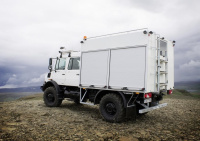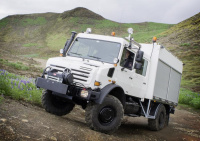 Der hochgeländegängige Unimog U 4000 bewältigt mit seinem bewährten Vierzylindermotor OM 924 LA mit 160 kW (218 PS) Leistung auch schwierigstes Terrain auf der vulkanreichen Insel im Nordmeer. Dabei trumpft er vor allem mit seinen Portalachsen sowie extremer Achsverschränkungsmöglichkeit dank Schraubenfedern und einer Watfähigkeit von bis zu 1,20 m auf. Für optimale Fahreigenschaften und -komfort im Gelände spielen die 3-Punkt-Lagerung von Motor, Getriebe und Fahrerhaus sowie die doppelte 3-Punkt-Lagerung des Aufbaus eine wesentliche Rolle.