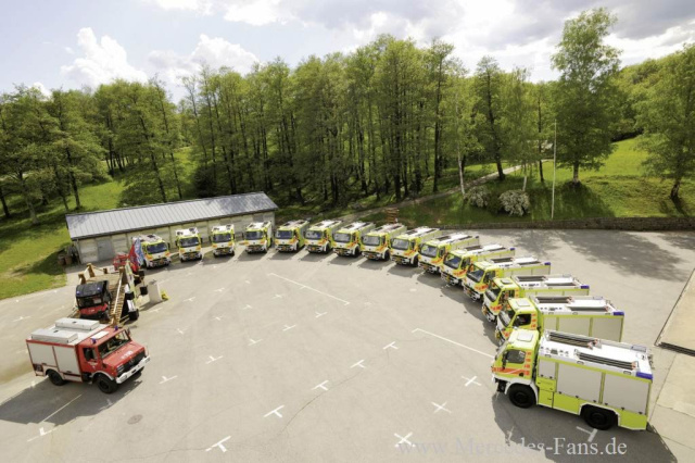 Unimog. Reichlich Leistungsreserven, Zapfwellen, Nebenabtriebe und eine leistungsstarke Hydraulik, komplettiert um den topaktuellen Stand der Lkw-Technik bei Sicherheit, Bedienung und Umweltverträglichkeit - das alles zusammen macht den Unimog U 20 zum leistungs- und strapazierfähigen Einsatzfahrzeug ganz im Stil der beiden größeren Baureihen. Dies sind die Geräteträger U 300, U 400 und U 500 sowie die hochgeländegängigen U 4000 und U 5000. Der Vierzylinder-Reihenmotor des Unimog U 20 leistet 130 kW (177 PS), das Getriebe hat acht Vorwärts- und sechs Rückwärtsgänge und erlaubt eine Höchstgeschwindigkeit von 90 km/h. Das moderne Fahrerhaus erleichtert der dreiköpfigen Feuerwehrbesatzung durch komfortable Ausstattung und ausgefeilte Ergonomie die Arbeit nachhaltig.