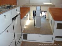 Während der Fahrt senken sich die Wände des Aufbaus flächenbündig aufeinander, so dringt kein Schmutz ins Innere. Der Ausbau der Wohnkabine besteht aus leichten Möbelplatten, alle Türen und Schubladen werden von Kompressionsverschlüsse verriegelt. Bei der Auswahl von Küchen-, Tisch- und Fußbodenplatten wurde hingegen weniger auf das Gewicht geachtet. Hier kommt echter Granit aus Italien zum Einsatz. Ein Wunsch des Besitzers, der Steinmetz von Beruf ist. Damit er auch im Winter mollig warme Füße hat, installierten Langer & Bock eine Fußbodenheizung unter dem kühlen Marmor.
