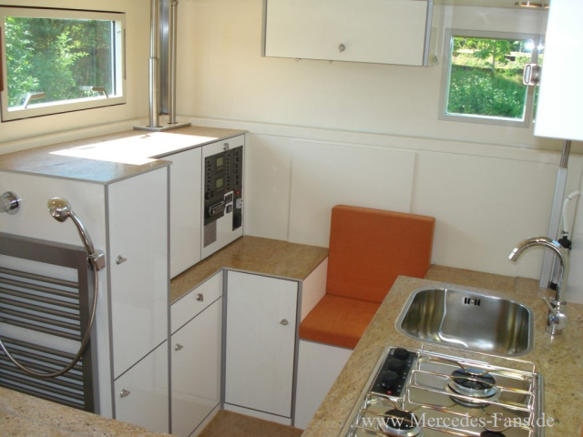 Innenausbau: Hochglanz weiß mit Teakholzeinfassung; Granitfußboden-, Arbeitsflächen u. Duschtasse mit eingebauter Besonderheit Technik: 230V Induktionsherdfeld, 240W/24V Solaranlage mit MPP-Regler, Kombilader 100A Ladestrom, Isolierglasfenster, Arctis Dachlukenverglasung, absolut einbruchsichere Eingangstür mit Schließanlage, Durchgangstür mit Betäubungsmitteldüse und Türspion, Granitfußboden-, Arbeitsflächen u. Duschtasse mit eingebauter Fußbodenheizung, Kombilader 100A Ladestrom u. 4kW 230 V Leistung, Warmwasser-Zentralheizung mit 30 Liter Schiffsboiler, Fußbodenheizung und Design-Heizkörper, Durchgangstür mit Betäubungsmitteldüse und Türspion. LED Lichttechnik, UV-Wasserfilteranlage. Elektrisch verstellbarer Tisch. vier Sitzplätze, vier Steckdosen 12/24Volt, vier Steckdosen 230 Volt