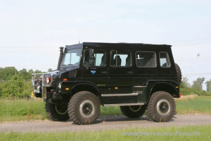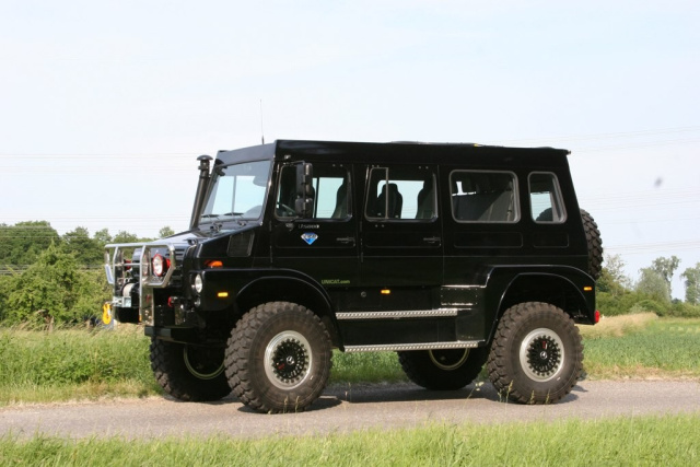 Der Unimog könnte also überall auch dort zum Einsatz kommen, wo selbst der Mercedes G, der Kult-Geländewagen aus Stuttgart, an seine Grenzen stößt. Der Phantasie sind vor allem bei der Innenausstattung keine Grenzen gesetzt: Mit eingebauter Bar, TV und komfortablen Sitzen gerät die Dienstfahrt zum perfekten Abenteuer mit allem Komfort. Knüller des Fahrzeugs: Anders als beim serienmäßigen Unimog können bis zu acht Personen im durchgängig karossierten Fahrzeug bequem und sicher von A nach B gelangen. Wobei B auch durchaus abgelegen und von Straßen nicht erreichbar sein darf.